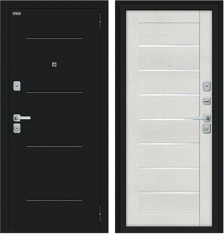 Надежная входная Дверь Браво Техно/BChrome Букле черное/Bianco Melinga премиум класса по цене 35 551 руб. Большая толщина стали защитит от проникновения в ваш дом, квартиру или коттедж. Используется очень качественная фурнитура: замки, цилиндры, ручки, защелки. Покрытие и отделка двери изготовлено под внимательным контролем производителя. Дверь имеет долгий срок службы и гарантию.